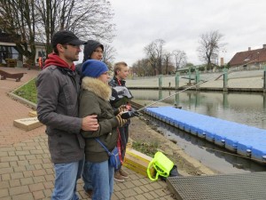 Sternicy z nadajnikami przy pomoście (Dominik Zaborniak – Zielona Góra POL50, Jakub Kosiak POL40 z córką i Kamil Musiejkiewicz POL16 – Nowa Sól)
