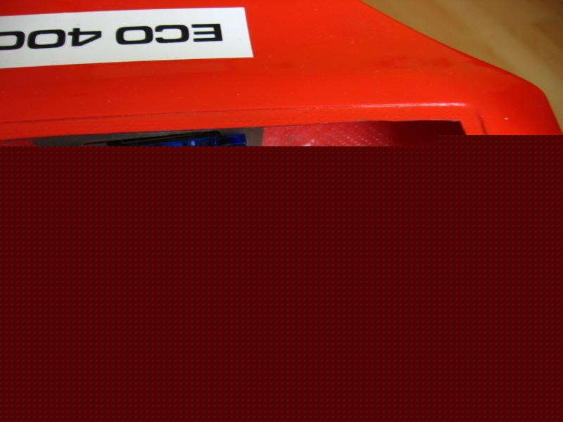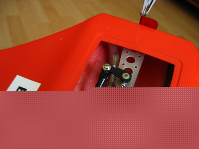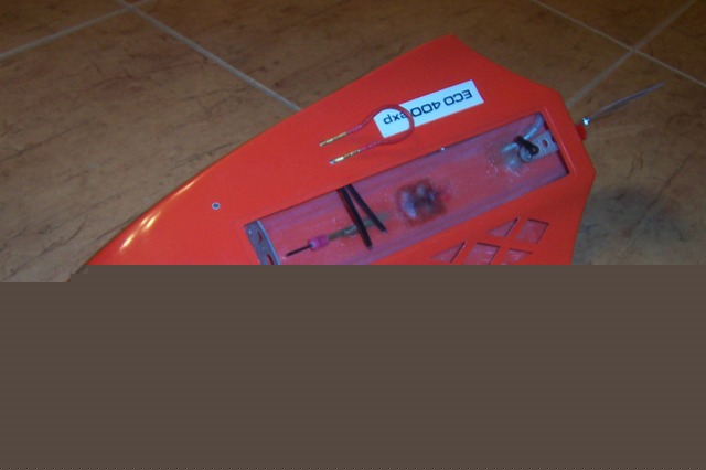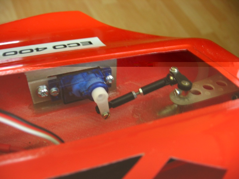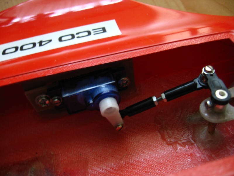 Serwo steru kierunku powinno być możliwie małe i lekkie. Musi być szybkie i jednocześnie mieć jak największą moc (uciąg) . Mocowanie i popychacz musi być na tyle sztywny, aby podczas pływania nie była na sterze żadnych luzów. Dźwignia steru nie może haczyć o żadne wyposażenie wewnątrz modelu (szczególnie mam tu na myśli pakiet, odbiornik, antenę i różne przewody). Można użyć serwa 9 gram, lub 18 gram. Na początku chciałem zastosować mocniejsze i szybsze cyfrowe serwo 20 gram Scaner RC (3,8 kG uciągu), posiadające metalowe zębatki (takie z pewnością posłuży nam dłużej, dodatkowo cyfrowe sterowanie pozwala osiągnąć większą precyzję ruchu i szybszą reakcję na ruch drążka). Okazało się jednak, że jest ono wyższe niż serwo HXT900 i dźwignia będzie haczyć o pakiet napędowy (gdy bedę pływał na 2S 1800).