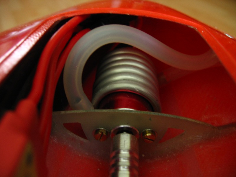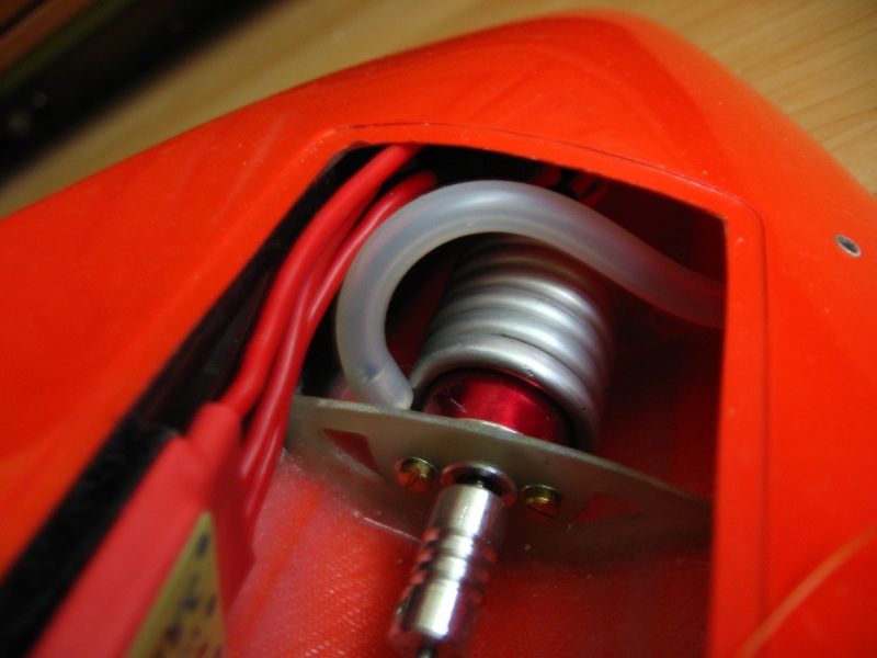 warto by je zastosować, na pewno przedłuży to żywotność silnika i regulatora. Chłodzenie silnika jest szczególnie ważne. Zarówno rurka wlotowa i wylotowa wody wykonana jest z cienkościennej rurki aluminiowej o średnicy zew 4mm (można użyć też mosiężnej). Ważne jest by wlot pokrywał się równo z dnem a nie wystawał – powodowałby duży opór i niepotrzebne zużycie prądu. Wężownice na silnik można wykonać z tej samej rurki. Pamiętajmy że przewody silikonowe, które chcemy stosować do chłodzenia muszą ciasno wchodzić na rurki – inaczej mogą z nich spaść w czasie biegu i uszkodzić elektronikę, a w najgorszym wypadku utopić model. Dobrze, gdy przewody silikonowe którymi płynie woda są grubościenne.