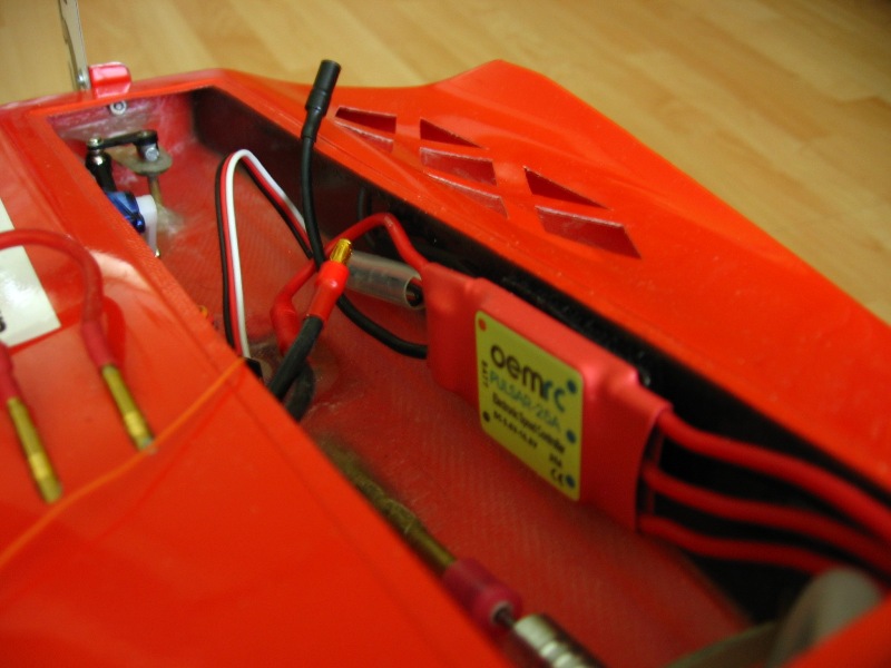 Regulator najprościej przymocować na rzepa do przegrody, warto go uszczelnić wlewając dokładnie z obu stron pod jego koszulkę silikon w celu zabezpieczenia przed zwarciem wywołanym przez wodę. U mnie zastosowałem regulator 25A, planuję że pobór prądu nie będzie przekraczał 15A, co pozwoli na 10-12 minut rekreacyjnego pływania dla silnika 2400KV. Dla silnika 3800KV może się okazać on niewystarczający, zobaczymy w praktyce.