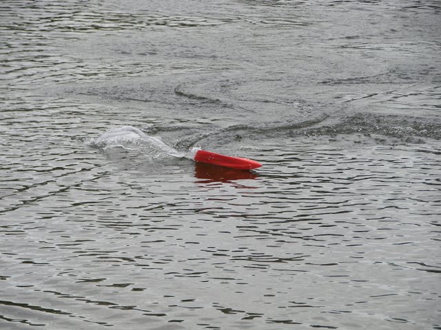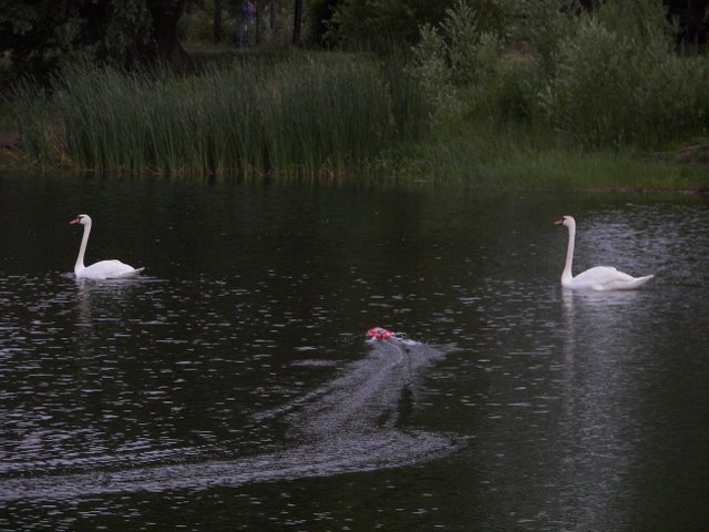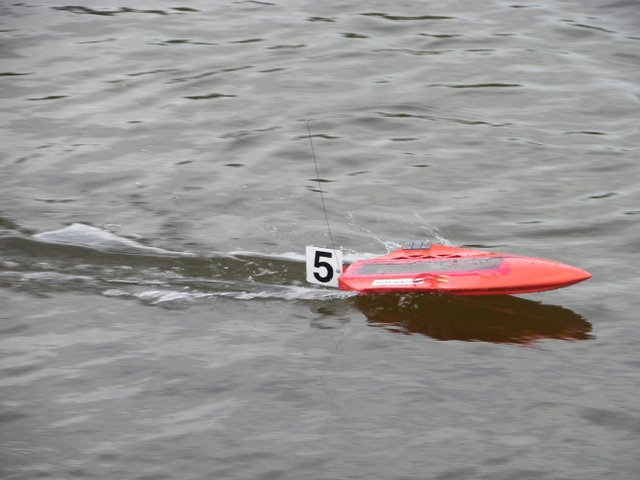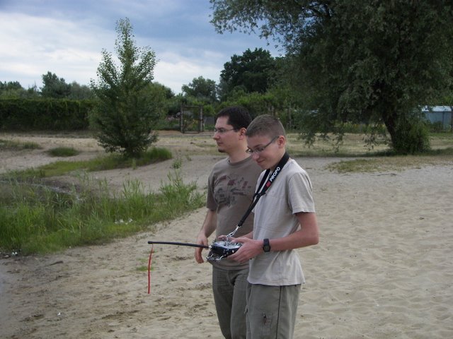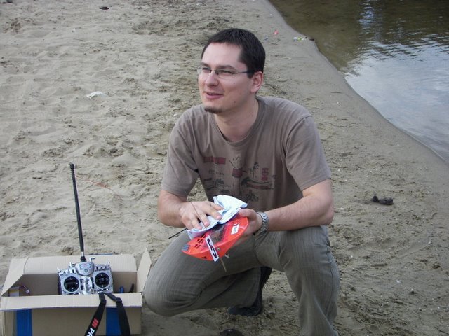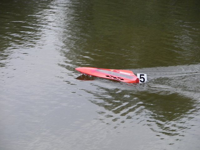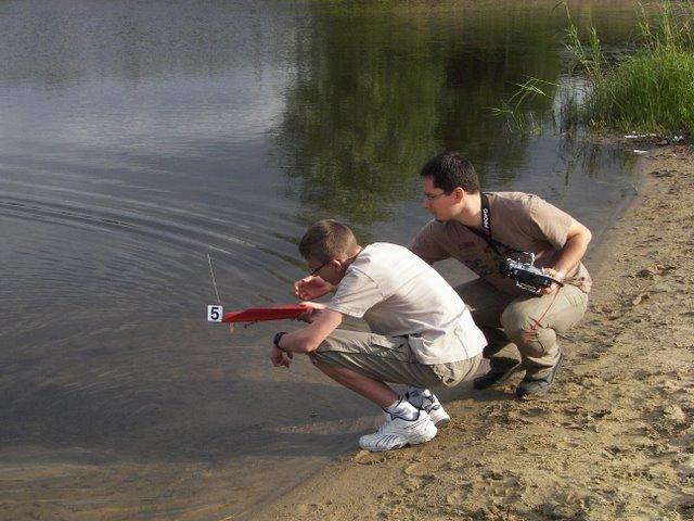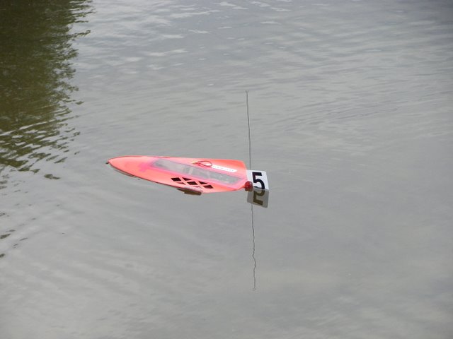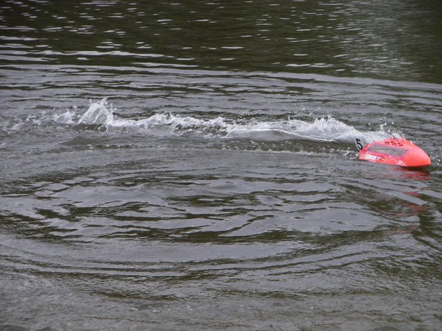 Model z pakietem Li-Pol jest lżejszy niż z Ni-Mh ale i tak jego zanurzenie „podczas postoju” jest znaczne. W półślizgu wynurza się już z wody. Na testy modelu zabrałem się z Leonem (to on robił fotki pływającego modelu) i Michałem Wiśniewskim, który tez testował łódkę. Miejsce to „Koci staw” 200 metrów od portu w Nowej Soli. Na jednym ze zdjęć widać naturalne, ruchome bramki (łabędzie), które pomagały w treningu 😉