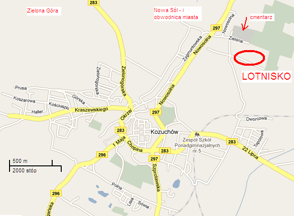 Jadąc z Zielonej Góry proponuję dojazd od strony Nowej Soli. Drogą S3 do Nowej Soli, następnie zjazd w stronę Nowej Soli (prawoskręt). Dalej na skrzyżowaniu (wybór między kierunkiem Nowa Sól a Kożuchów) skręcić na Kożuchów w lewo. Po dojechaniu do Kożuchowa (ulicą Nowosolną), skręcić w lewo w ulicę Zieloną (kierunek cmentarz komunalny). Przed samym cmentarzem skręt w prawo (w stronę domów stojących na polu). Dalej około 100m za domami skręt w lewo i po około 75m jesteś na lotnisku (lekko na górce). W razie problemów z dojazdem proszę dzwonić pod numer 605 590 370 (Kamil).