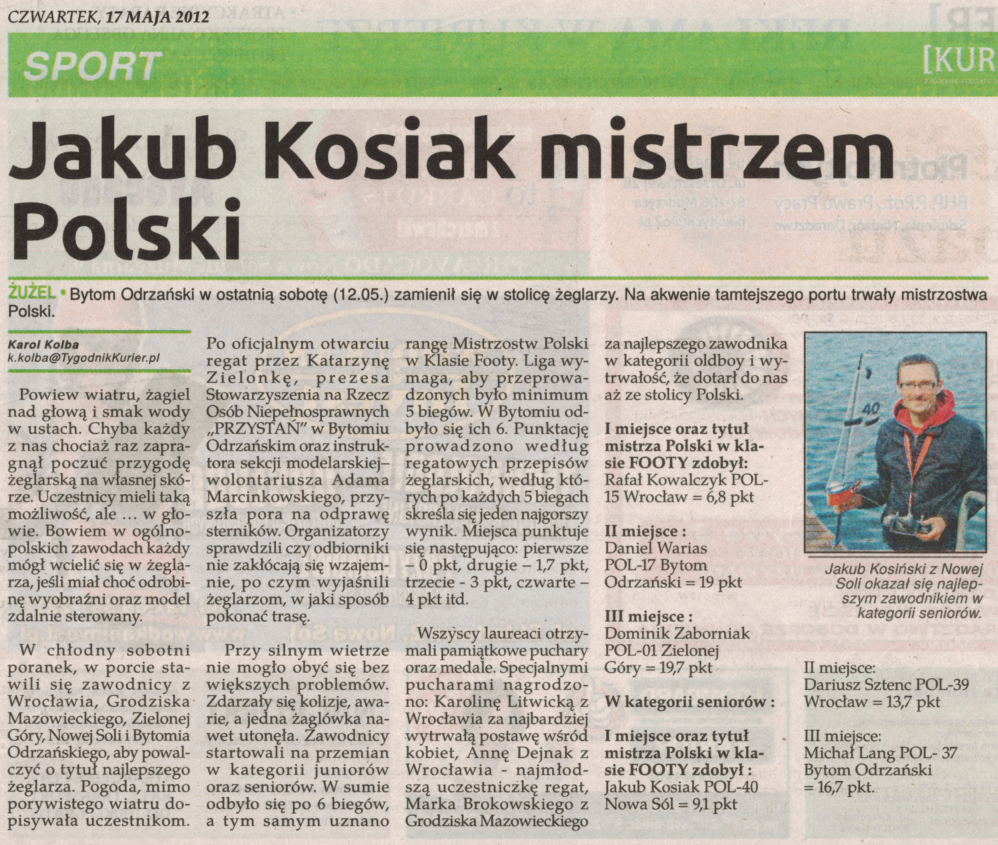 Poniżej scan artykułu który ukazał się w Kurierze Sportowym (dodatku do Kuriera – Tygodnika Powiatu Nowosolskiego) z dnia 17.05.2012 (nr 32) zatytuowanego: „Jakub Kosiak mistrzem Polski”