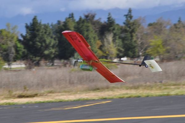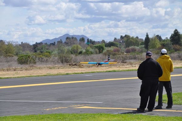 Silnik bicepsa wyje na wysokich obrotach. Chwilę przed startem Bartek zoptymalizował skład mieszanki paliwowo-powietrznej, by osiągnąć jak największą moc w aktualnych warunkach. Samolot rusza przed siebie. Widać, że ciąg silnika walczy z dużą bezwładnością – cała maszyna waży teraz około 18 kilogramów. Po chwili rozpędu pilot przestawia w nadajniku przełącznik odpowiedzialny za zamknięcie przerywaczy i opuszczenie klap, delikatne wysklepiających profil skrzydła. Na start mamy wydzielone tylko 200 stóp pasa. Maszyna odrywa się niedaleko przed linią, oznaczającą koniec strefy rozbiegu.