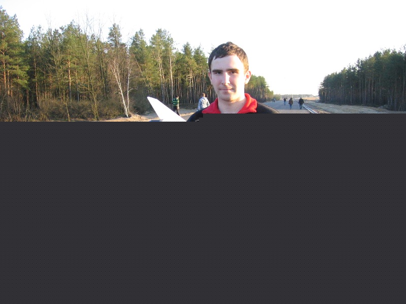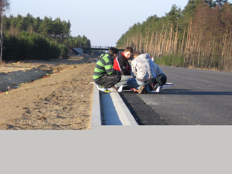 Na miejscu zastaliśmy bardzo wielu niedzielnych spacerowiczów. A i trudno się dziwić. Pogoda wspaniała, ciepło i słonecznie (prawie lato). Poranny, trochę mocny wiatr ucichł, a słońce zagwarantowało nam piękną scenerię do popisów powietrznych. Popisów wprawdzie nie było za wiele, ale zawsze to coś. Na początek wypróbowaliśmy mój model (skrzydełko). Już na wstępie Kamil pokazał mi drobne (lub mniej drobne) błędy, ale całość zdawała się zdatna do lotu. Tak więc pierwszy samodzielny lot szybowcowy wypadł prawie doskonale. Prawie, ponieważ okazało się, że lotki reagują odwrotnie (prawo=>lewo, lewo=>prawo). Ale obyło się bez uszkodzeń, podczas niezgrabnego lądowania. Potem lot z napędem. Cud, miód. Pierwszy, dziewiczy lot zachwycił nie tylko moje oczy, ale także przypadkowych przechodniów (przynajmniej mam taką nadzieję xP ).