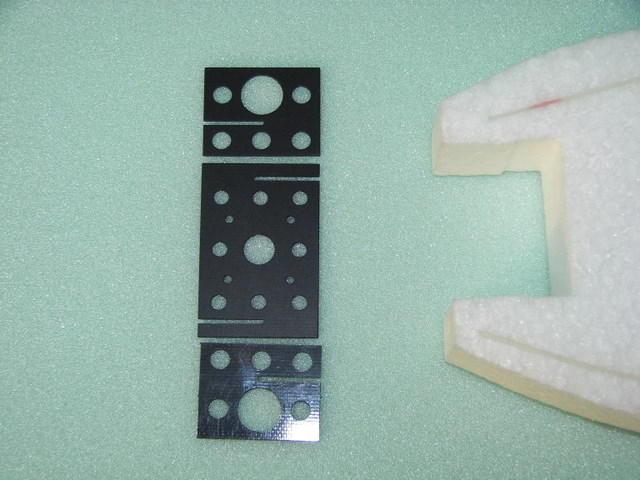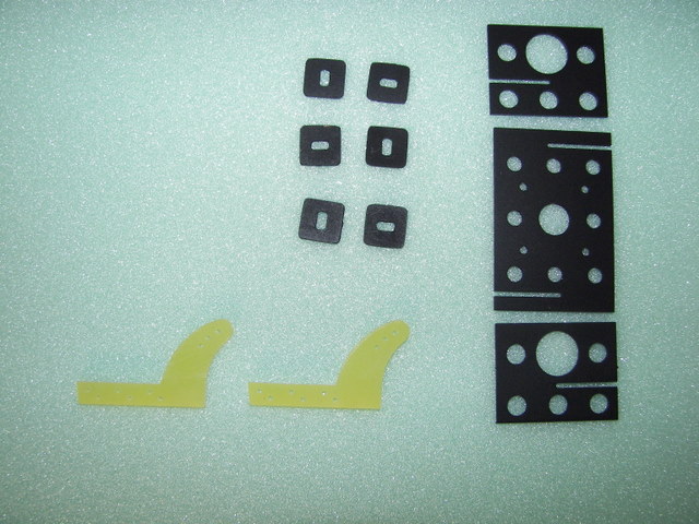 Wcześniejsze wycięcie otworów na serwa, skraca czas budowy. Płaskowniki, mocowanie silnika oraz drobne akcesoria, zostały wycięte z lominatu.