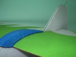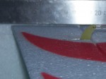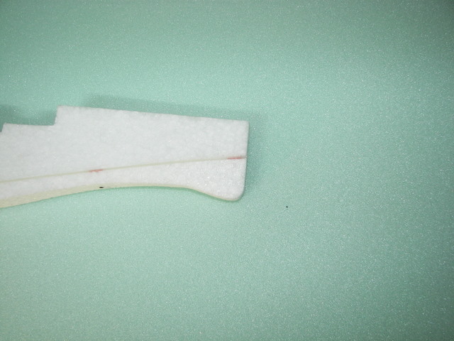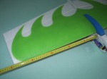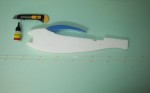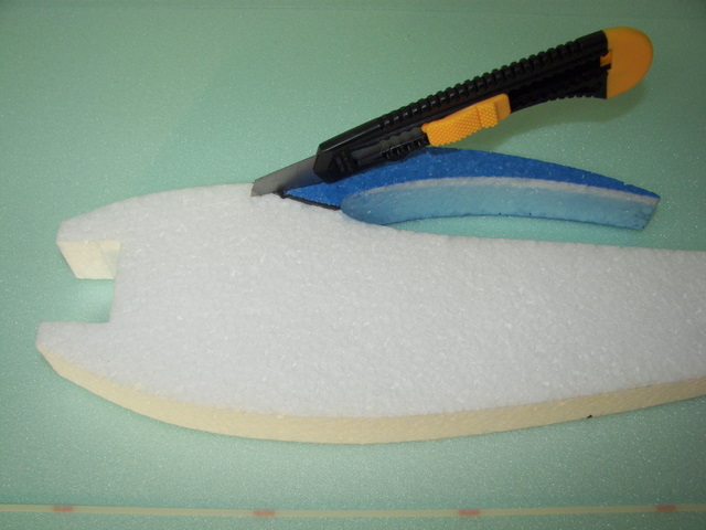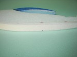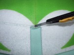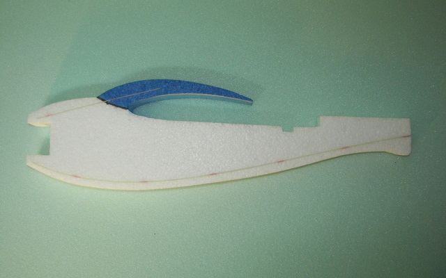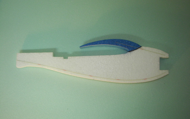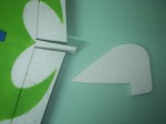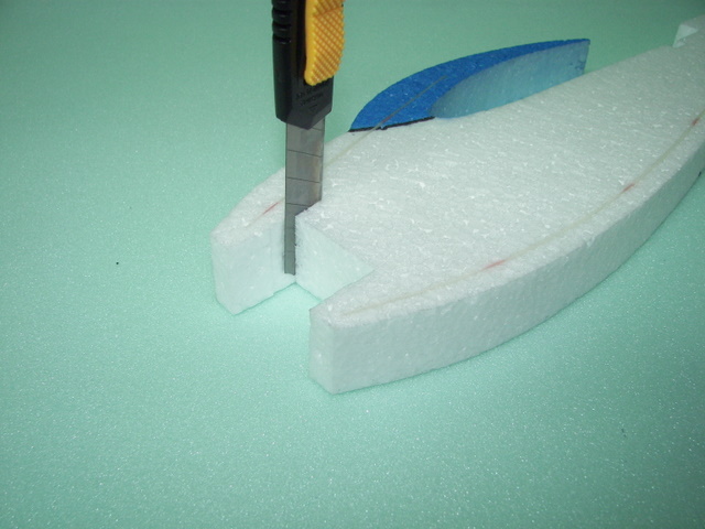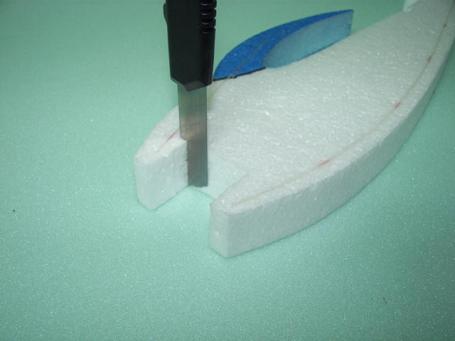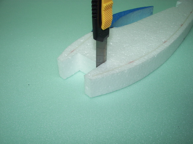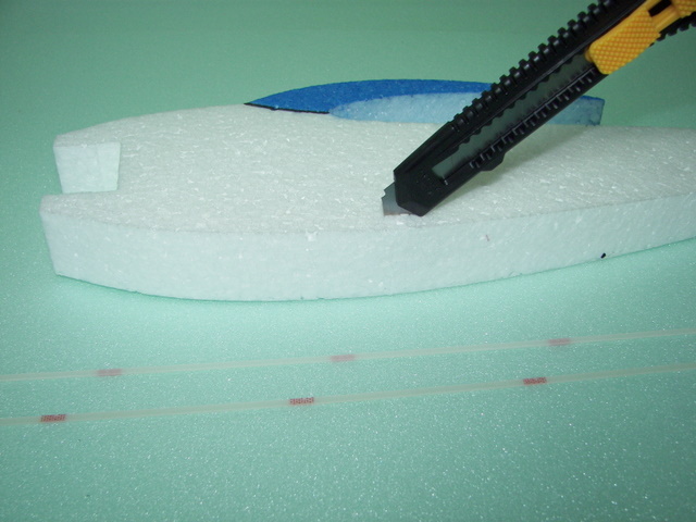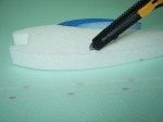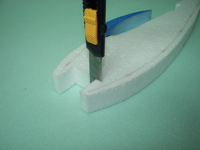 Kadłub jest wycięty z wiotkiego materiału, i dla tego trzeba go wzmocnić, np. płaskownikami z laminatu. Zrobimy to nacinając nożem długą szczelinę u dołu kadłuba (w odległości, na oko 10 – 15 mm od krawędzi materiał) na głębokość około 4 mm. Krótszą szczelinę robimy w górnej części kadłuba. Gdyby były problemy z tą czynnością – można pomóc sobie wycinając z kartki papieru szablon.