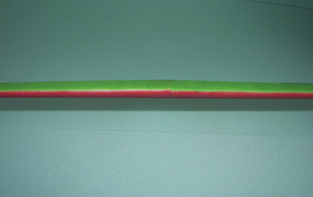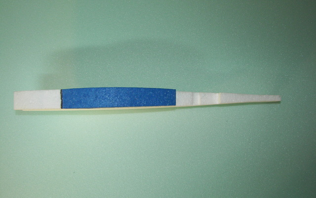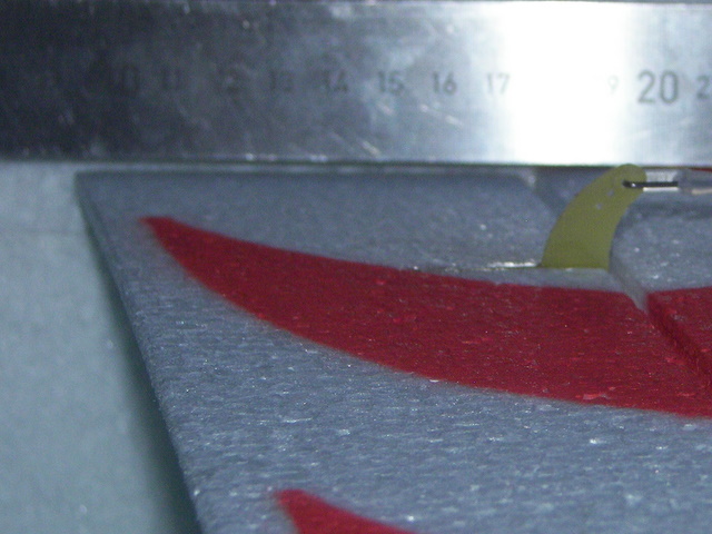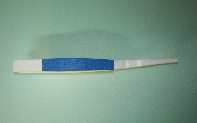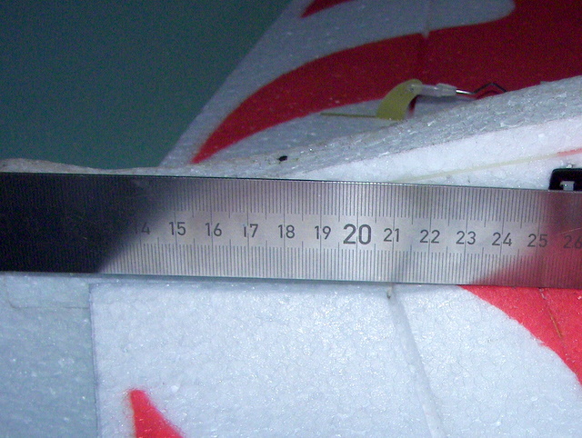 Po sklejeniu połówek skrzydła, trzeba je usztywnić przy pomocy płaskowników. Ponieważ płaskowniki są krótsze od skrzydła, należy umieścić je w jednakowych odległościach od końców płata. Aby to zrobić trzeba wykonać długie nacięcie. Ułatwi to posłużenie się stalową linijką. Odległość płaskownika od natarcie skrzydła jest widoczna na planie modelu (pdf), i wynosi 110mm.
