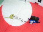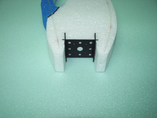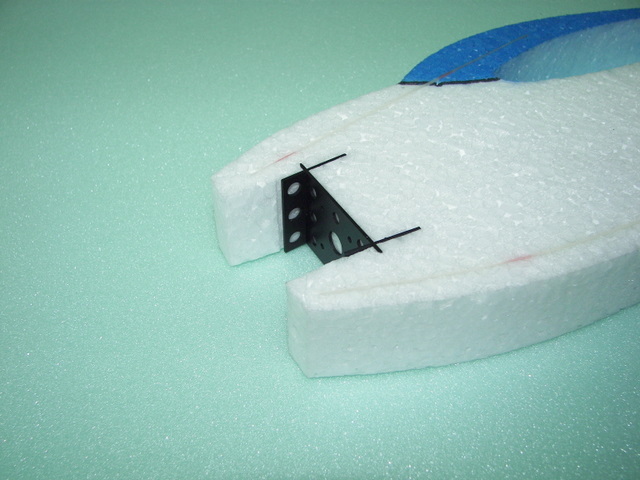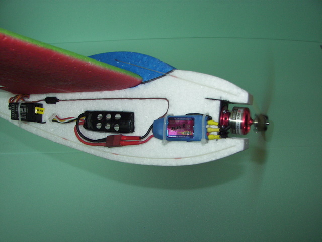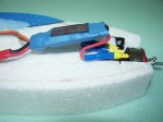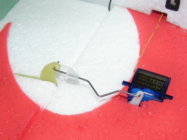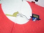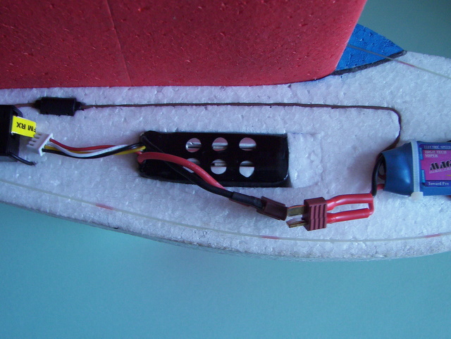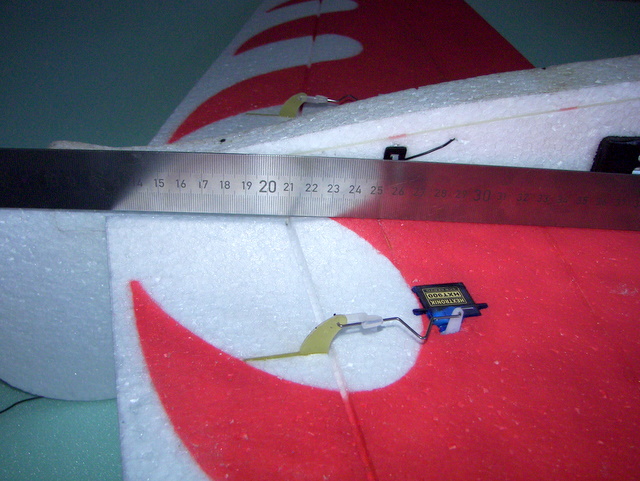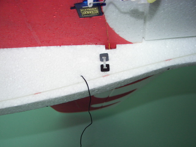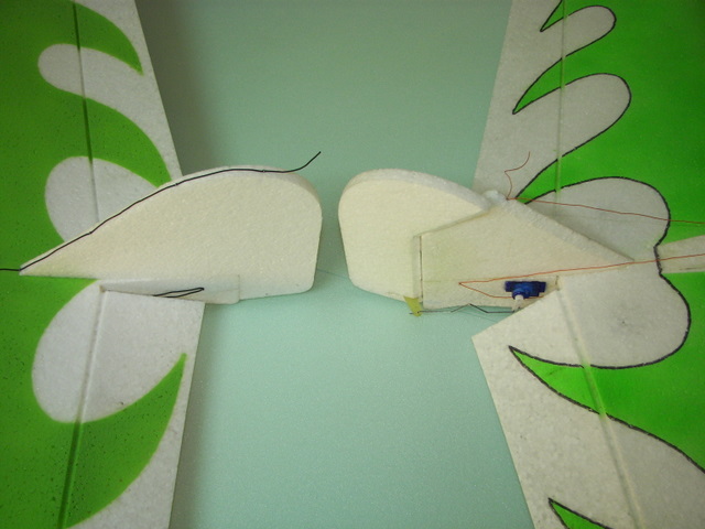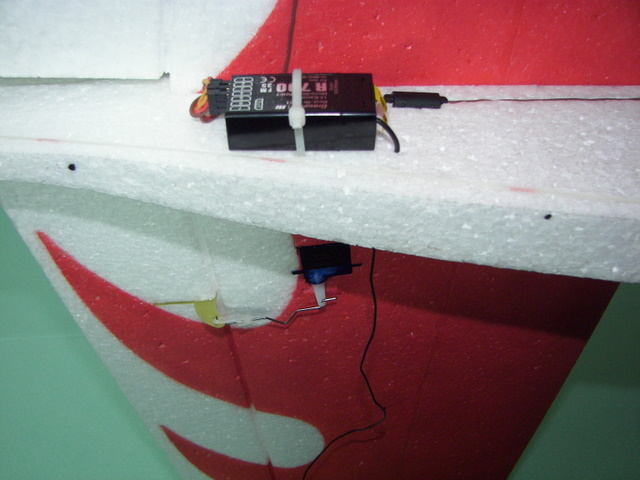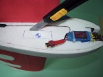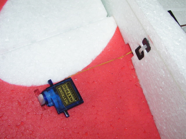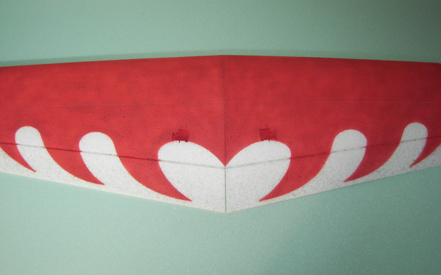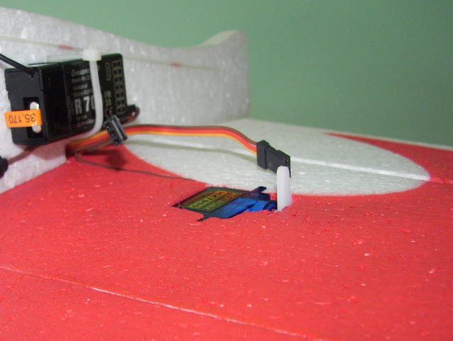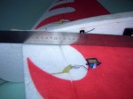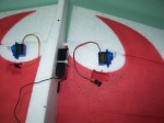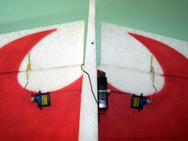 Serwa wciskamy w uprzednio wycięte gniazda. A przewody prowadzimy w nacięciach wykonanych ostrym nożem. Podłączamy zasilania i sprawdzamy czy dźwignie serwomechanizmów wychylają się w odpowiednich kierunkach. W razie potrzeby należy przestawić rewers z nadajniku lub zamienić serwa miejscami, jeśli jest to konieczne. Nadajnik musi mieć funkcję MIX – klapo – lotek, czyli układu latającego skrzydła. Jeśli nie ma, wówczas trzeba zastosować mikser elektroniczny. Można taki kupić w sklepie modelarskim lub na Allegro w cenie 20 – 30zł. Serwa trzeba zabezpieczyć przed przesunięciem kilkoma kroplami kleju polimerowego ( do styropianu ). Ale dopiero wtedy gdy będziemy pewni, że dźwignie serw wychylają się w odpowiednich kierunkach i są ustawione prawidłowo ( nietrymowanie w pozycji – neutrum). Najlepiej zrobić to dopiero po oblataniu modelu.