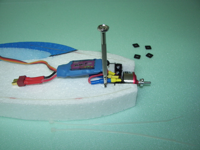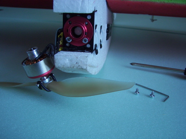 W tym przypadku model po włączeniu silnika zaczął mocno nabierać wysokości i wymagał podłożenia podkładek pod górne otwory mocujące silnik.
