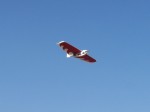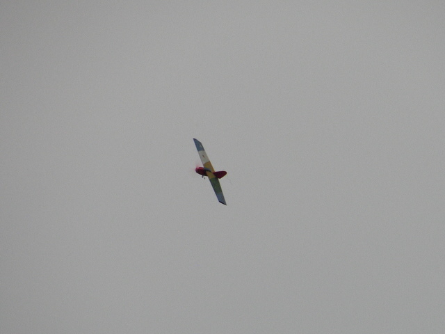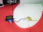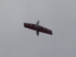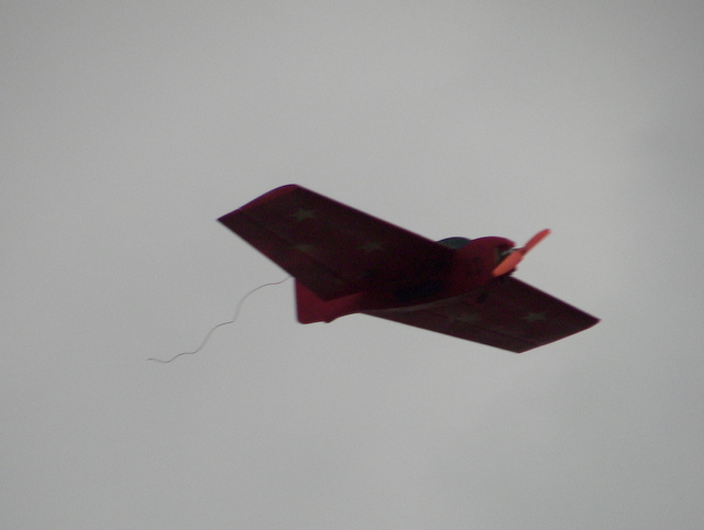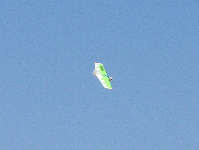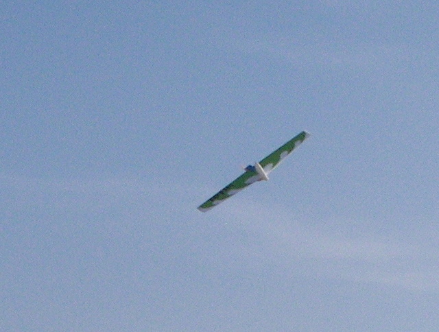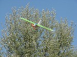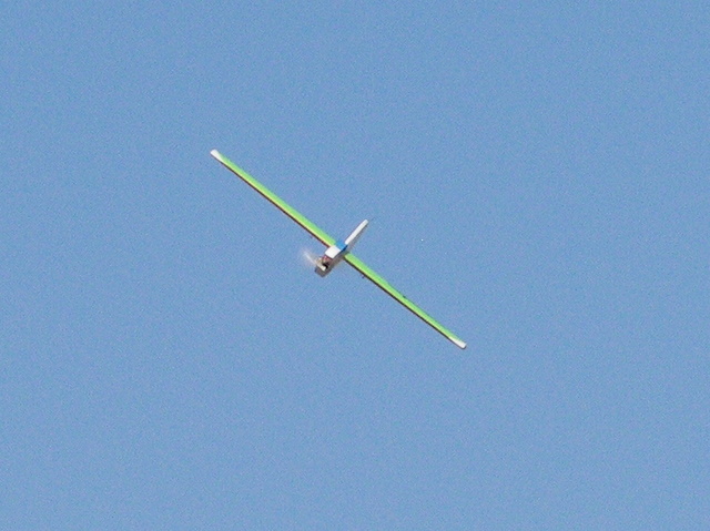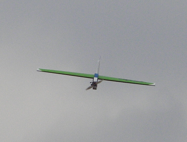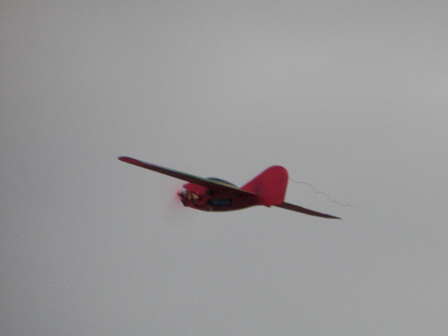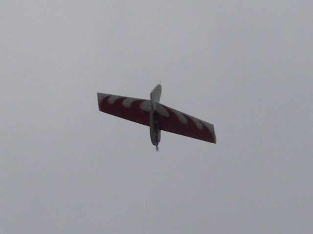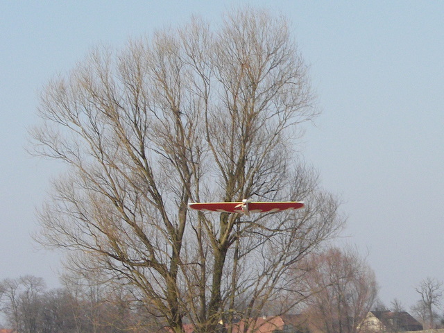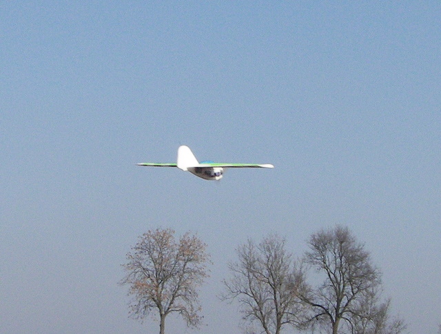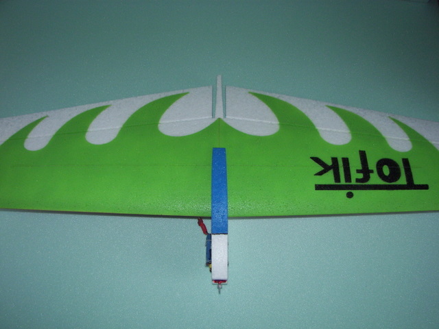W tym przypadku model rzucony z ręki pod wiatr z wyłączonym silnikiem przelatywał płasko ( bez pompowania) 10 – 12 metrów. I słabo reagując na stery spadał dziobem na ziemię. To stanowczo za mała odległość. Po przyklejeniu, przy pomocy naklejki monety 5-cio złotowej na ogonie, Tofik zaczął przelatywać odległość 25 – 30 metrów, dobrze reagować na ruchy sterów i miękko lądować