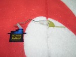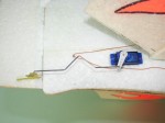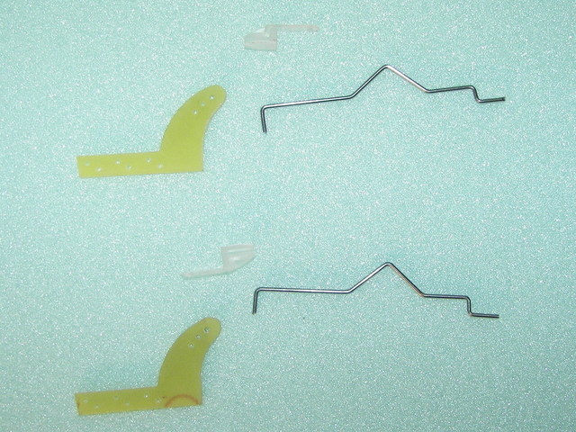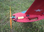 Popychacz dźwigni steru wykonany jest z wygiętego pręta stalowego fi. 1mm. I zabezpieczony przed wypadnięciem plastykowym snapem. Koniec drutu po obcięciu obcinaczkami trochę się spłaszcza. Aby bez oporu wszedł w otwór dźwigni, trzeba go trochę opiłować pilnikiem.