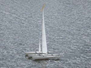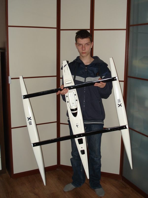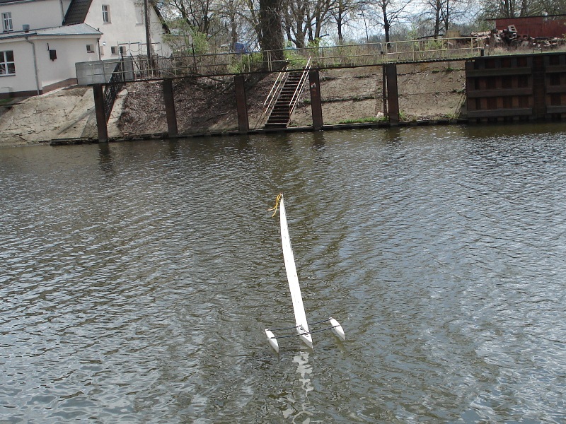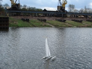 Model został opływany w trakcje akcji „Motoserce 2012” (21.04.2012) w porcie w Nowej Soli. Spisywał się naprawdę świetnie. Przy niewielkim wietrze (około 2-2,5 m/s) pływał całkiem dobrze, zwykła żaglówka praktycznie stała by w miejscu. Następnego dnia wiało mocniej (około 4m/s i model ładnie się przechylał i przecinał kadłubami wodę). W chwili obecnej jest ozdobiony kilkoma oryginalnymi naklejkami i nie był przemalowywany. Kadłuby są białe, kil i ster czarne, tak samo jak poprzeczki, maszt srebrny. Model wymaga jeszcze kilku drobnych poprawek (przemalowanie poprzeczek łączących kadłuby), ale ogólnie prezentuje się bardzo ładnie na wodzie 🙂