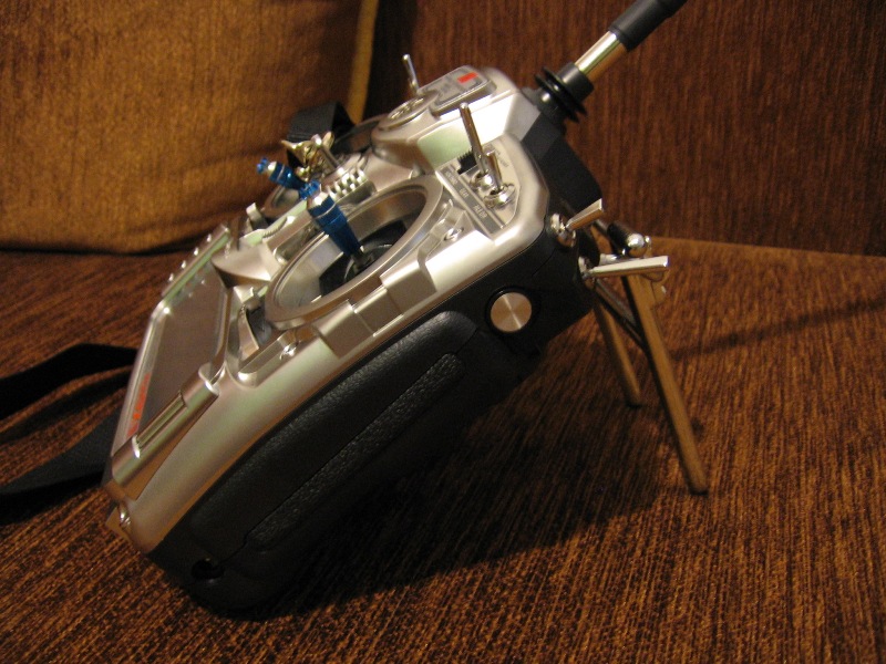 - Podstawka do stawiania nadajnika – to fajny i niedrogi bajer. Dzięki niej unikniemy porysowania tyłu i spodu nadajnika (szczególnie widoczne w nadajnikach typu MX-16s) podczas jego kładzenia na płasko. Może być plastikowa lub metalowa (lepasza) – oksydowane kolorowo aluminium. Ja wybrałem bardziej trwałą metalową.